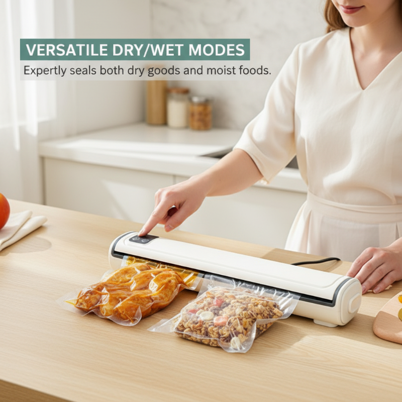 MODOS SECOS E MOLHADOS VERSÁTEIS - Vá além de apenas selar produtos secos. Esta máquina lida habilmente com alimentos secos e úmidos, de bifes a frango marinado, garantindo sempre uma vedação hermética, sem comprometer a textura ou o sabor dos alimentos.