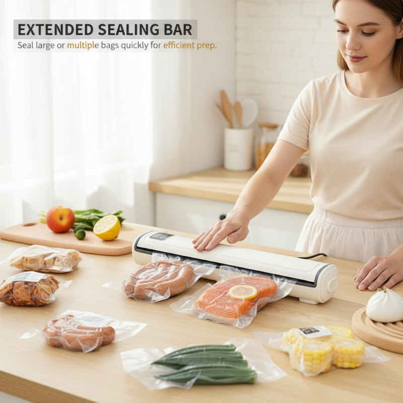 BARRA DE VEDAÇÃO ESTENDIDA - Sele itens maiores ou vários sacos pequenos de uma só vez com a barra de vedação larga. Isso economiza muito tempo em comparação com selantes menores, tornando-o ideal para preparação de refeições a granel ou uso comercial.