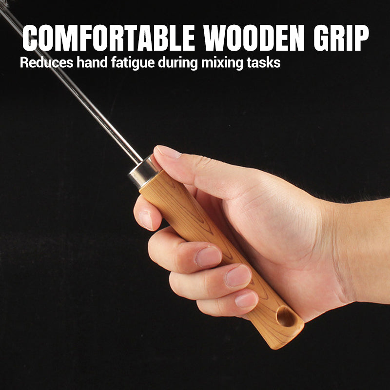 CABO DE MADEIRA ERGONÔMICO - Um cabo de madeira liso e espesso oferece uma pegada confortável e segura. Este design reduz a fadiga das mãos durante o uso prolongado, tornando a mistura de creme, ovos ou massa uma experiência mais agradável.